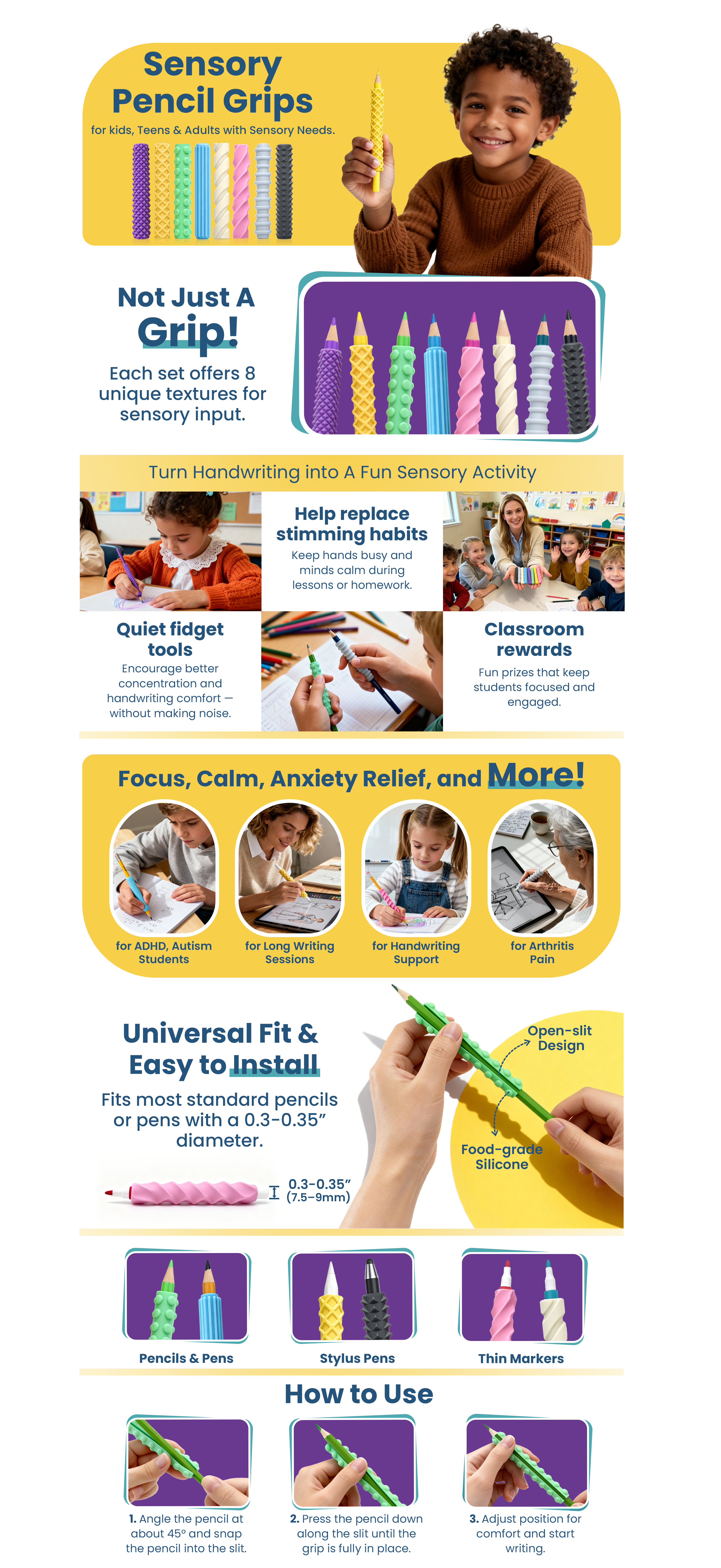 - Fun, Colorful & Educational: These textured pencil grips turn handwriting into a fun sensory activity while providing quiet anxiety relief. They help reduce stimming habits like nail biting, skin picking, or pen chewing. Ideal for classroom rewards or as teaching tools for educators.